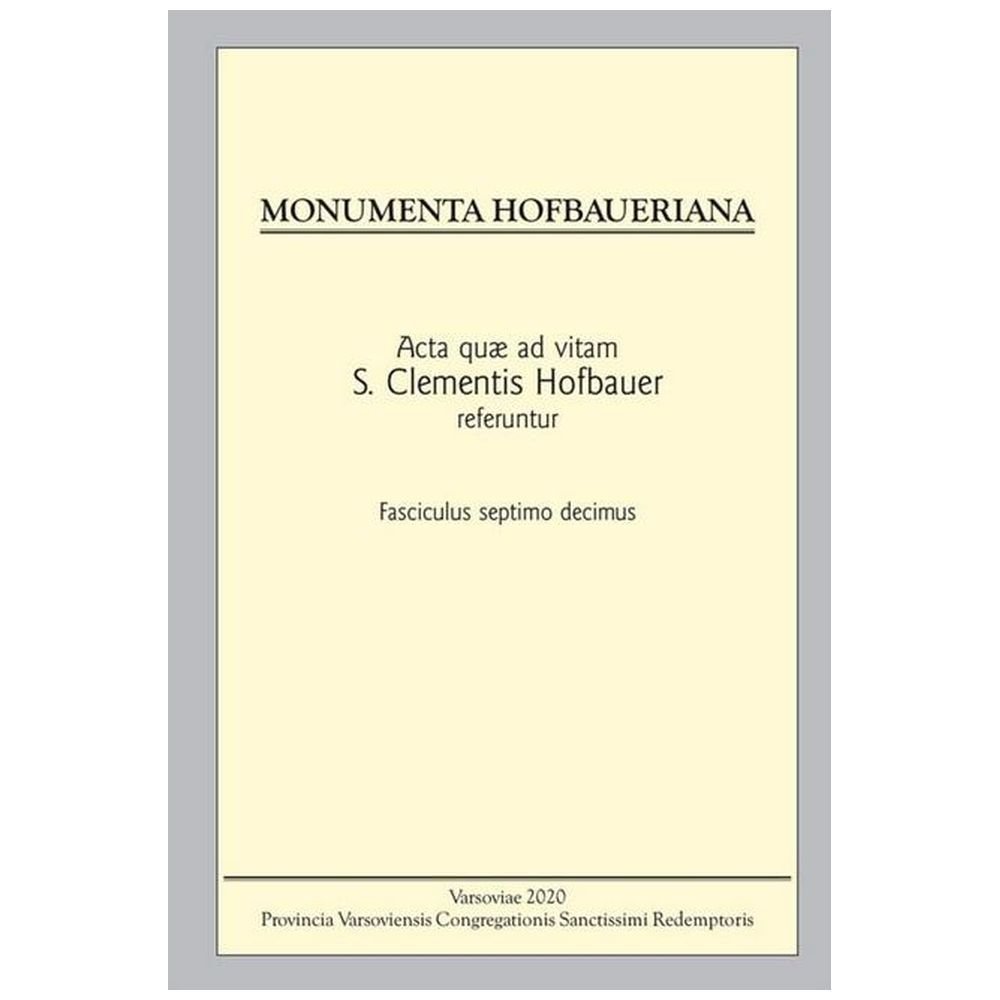 Jedną z inicjatyw podjętych przez Prowincję Warszawską Redemptorystów z okazji jubileuszu 200-lecia śmierci św. Klemensa jest publikacja kolejnego siedemnastego już tomu serii wydawniczej Monumenta Hofbaueriana, w której zamieszczane są dokumenty dotyczące jego życia i działalności. Tom, który oddajemy do rąk Czytelników, zawiera odnalezione w ostatnim czasie w archiwach polskich, francuskich i niemieckich nie znane nam dotychczas dokumenty odnoszące się do usunięcia redemptorystów z Warszawy w 1808 roku. Działalność duszpasterska św. Klemensa miała charakter wielowymiarowy. Wszędzie tam, gdzie przyszło mu żyć i pracować, starał się odczytywać znaki czasu i dawać na nie odpowiedź. Stąd też wypływał ogrom podejmowanego przez niego apostolatu i stąd też nazywany był powszechnie mężem apostolskim homo apostolicus. Mimo że żył w okresie bardzo trudnym pod względem politycznym i religijnym, nieprzyjaznym Kościołowi i życiu zakonnemu, to swoją działalnością duszpasterską utorował drogę chrześcijańskiej odnowie, i to w znacznej mierze dzięki niemu dokonało się odrodzenie życia religijnego Warszawy i Wiednia na przełomie XVIII i XIX wieku.
