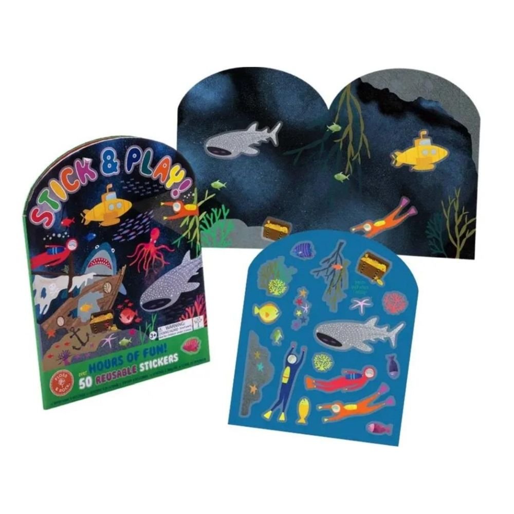 Zestaw Naklejek Wielokrotnego Użytku z planszami to świetna zabawa i nauka jednocześnie. W skład zestawu wchodzi ponad 50 zabawnych naklejek, w tym płetwonurków, rekiny, rozgwiazdy, skarby piratów i wiele innych, oraz 2 rozkładane plansze ilustrujące morska głebinę do tworzenia i wymyślania historii za pomocą naklejek. Naklejki można łatwo umieszczać, nakładać na siebie i zmieniać ich położenie. Dodatkową atrakcją jest dopasowywanie naklejek do ich kształtów na kartach do przechowywania, co zapewni maluchom rozrywkę na długie godziny! Zestaw daje dzieciom nieograniczone możliwości wyrażania swojej kreatywności, ćwiczy koncentrację i wyobraźnię, a także rozwija małą motorykę. Zapakowany jest w twardą okładkę, składa się całkowicie na płasko, dzięki czemu idealnie sprawdzi się w podróży. Cechy: