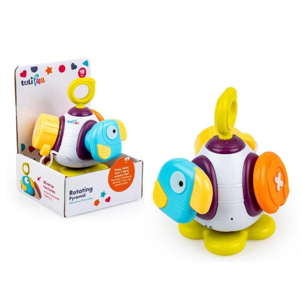 Praktyczna zabawka w kompaktowym rozmiarze zapewni maluchowi zręcznościową rozrywkę, niezależnie od miejsca, w którym się znajduje. Na każdej ze ścianek piramidki kryje się inne zadanie do wykonania: obrotowy element, piszczący ptaszek do naciskania, wtyczka do dopasowania w otwory i wciskania, a także terkoczący element do przekręcania. Po ustawieniu piramidki na kwiatku, zdobiącym jedną ze ścianek, można nią kręcić za pomocą paluszka.