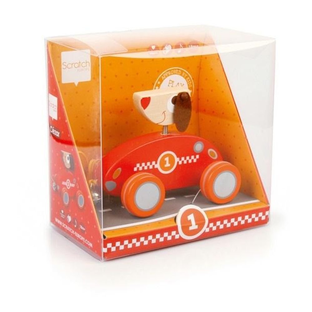 Zabawka nie pozostawia śladów na podłodze dzięki gumowym paskom, w które zostały wyposażone łapy pieska. Produkt wykonany z drewna.