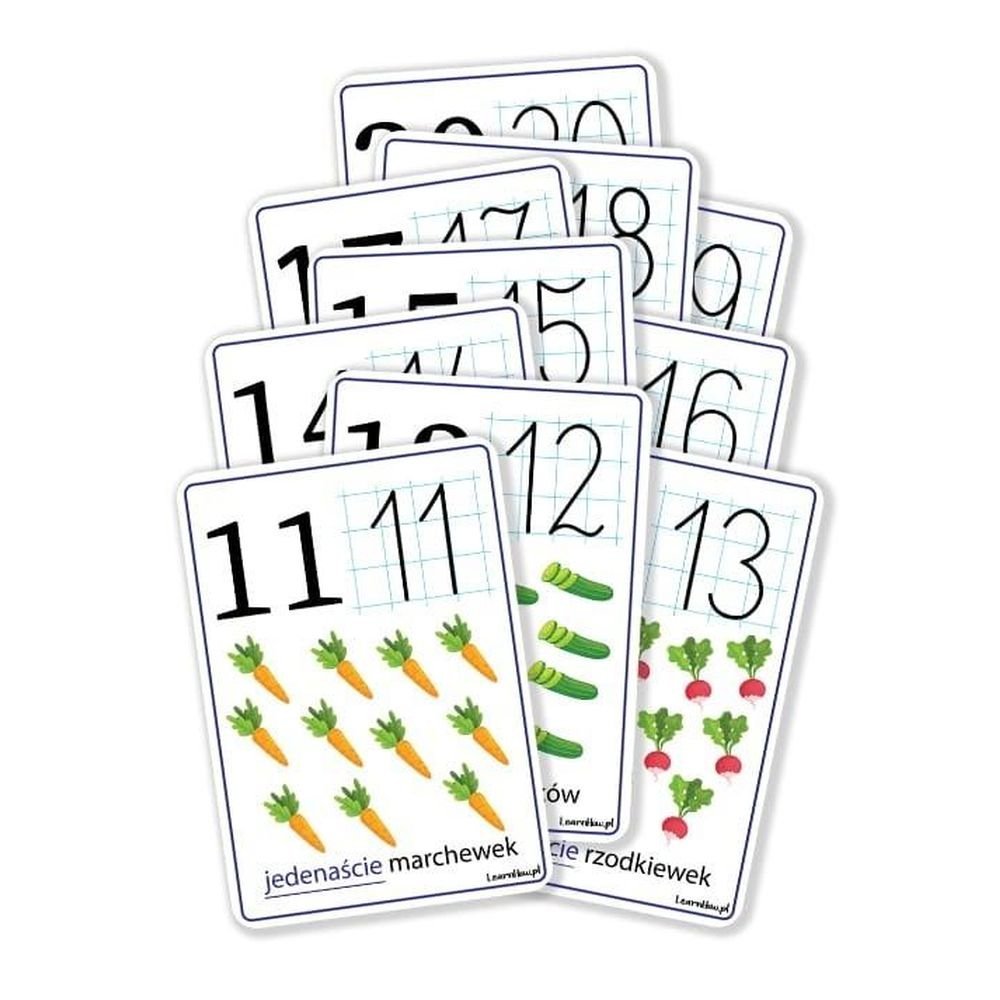Zestaw zawiera 10 kart w formacie A4(297mm x 210mm), karty są drukowane na grubym papierze 300g, dwustronnie zafoliowane oraz mają zaokrąglone rogi dla komfortu i bezpieczeństwa użytkowania.Zestaw zawiera następujące cyfry: 11, 12, 13, 14, 15, 16, 17, 18, 19, 20.