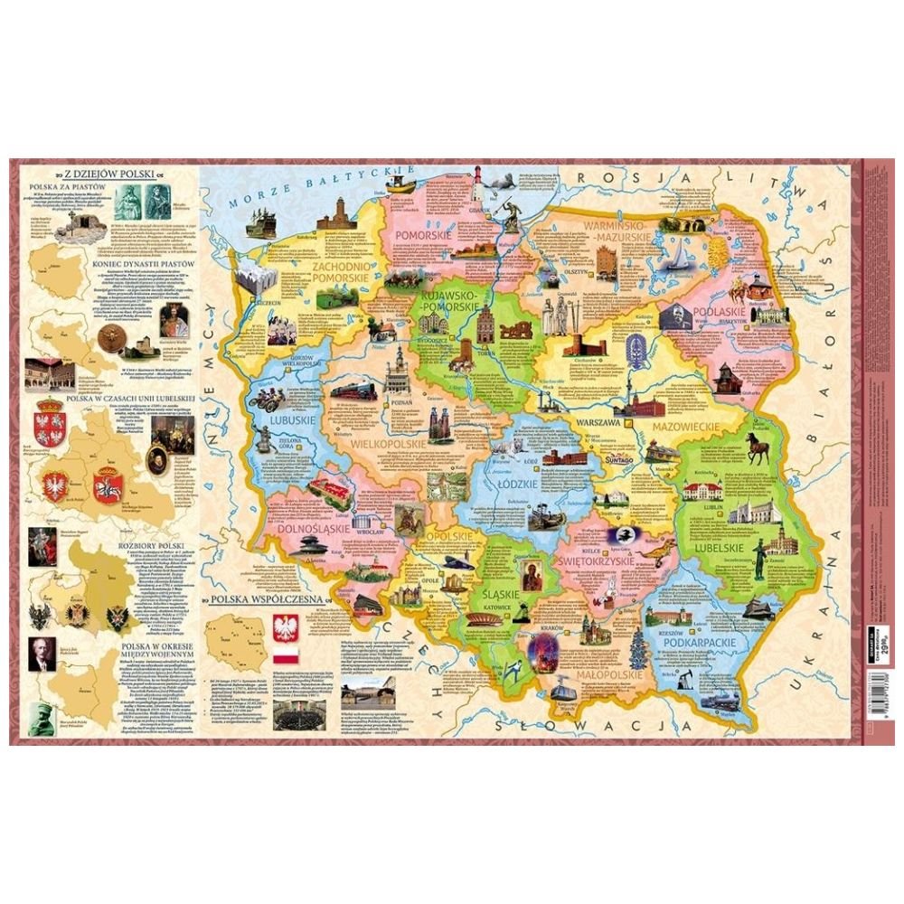 Podkładka powstała na podstawie Mappuzzle POLSKA REGIONY. To świetna pomoc w opanowaniu nazw województw i ich stolic, zapamiętaniu relacji wielkości i położenia ich siebie oraz w odniesieniu do Morza Bałtyckiego i granic z sąsiednimi państwami. W każdym województwie umieszczono obrazki z opisami wybranych zabytków lub atrakcji turystycznych. Podkładka zawiera także informacje o historii Polski, pokazuje jak granice naszego państwa zmieniały się na przestrzeni wieków, pozwala porównać powierzchnię Polski w kluczowych momentach jej historii.