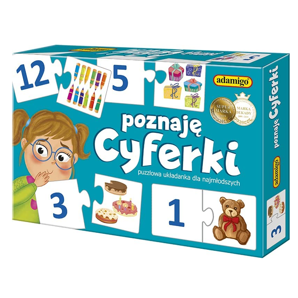 Pomysłowa gra puzzlowa, dzięki której w przystępny i przyjemny sposób najmłodsi poznają podstawowe cyferki.