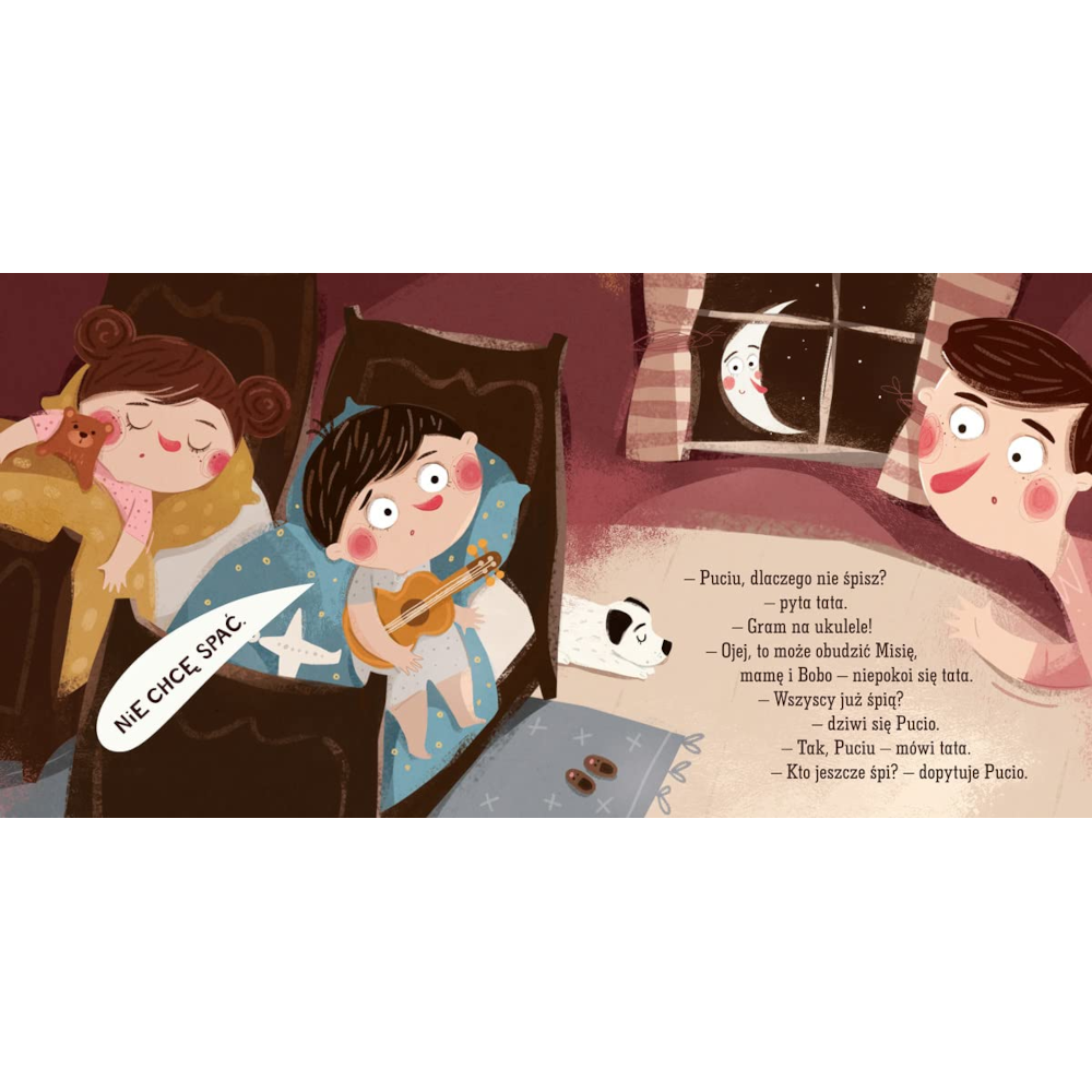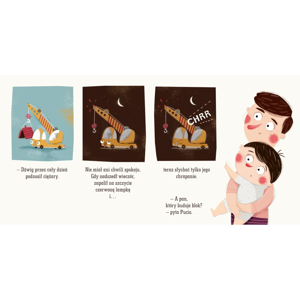 Pucio ma ochotę na zabawę, ale nadchodzi wieczór i wszyscy układają się do snu. Misia już śpi, więc trzeba być cicho, żeby jej nie obudzić. A co robią inni? Dźwig przez cały dzień nosił ciężary i teraz smacznie chrapie. Drzewo i samochód na parkingu też odpoczywają. Ciocia, która świętowała swoje urodziny, uśmiecha się przez sen. Budka z lodami jest zamknięta, a samolocik Pucia leży spokojnie pod łóżkiem. Ty też zgaś światło i słodko śpij – jutro czeka cię mnóstwo nowych przygód!