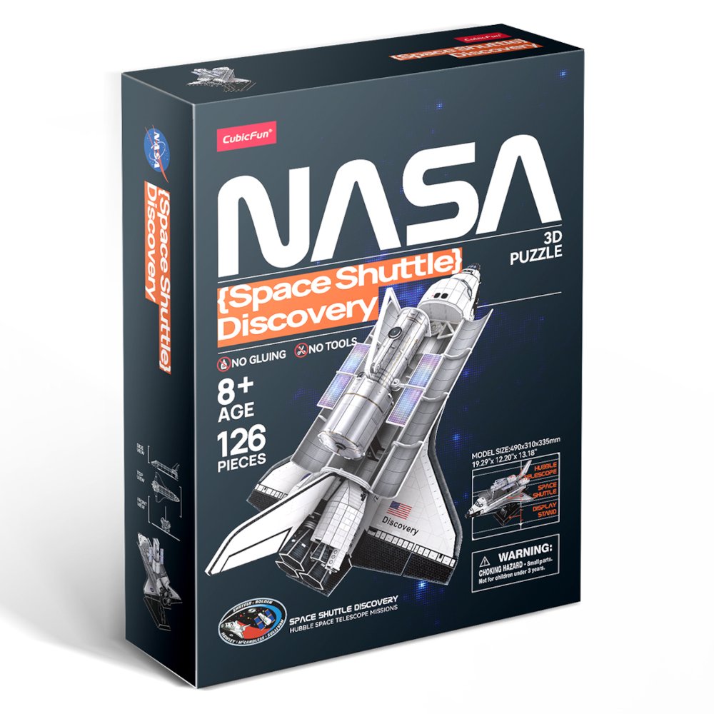Zestaw przygotowany na licencji NASA, przedstawiający najbardziej znane środki transportu i obiekty związane z kosmosem. Space Shuttle Discovery składa się z 127 elementów, które pozwalają na stworzenie budowli o wymiarach 49x31x33,5 cm. Te trójwymiarowe puzzle są wykonane z wstępnie wyciętego papieru i płyty piankowej, która jest bezpieczniejsza niż metal i drewno, bardziej realistyczna i lżejsza niż plastik. Ilustrowany podręcznik pozwoli młodym konstruktorom zbudować model samodzielnie.