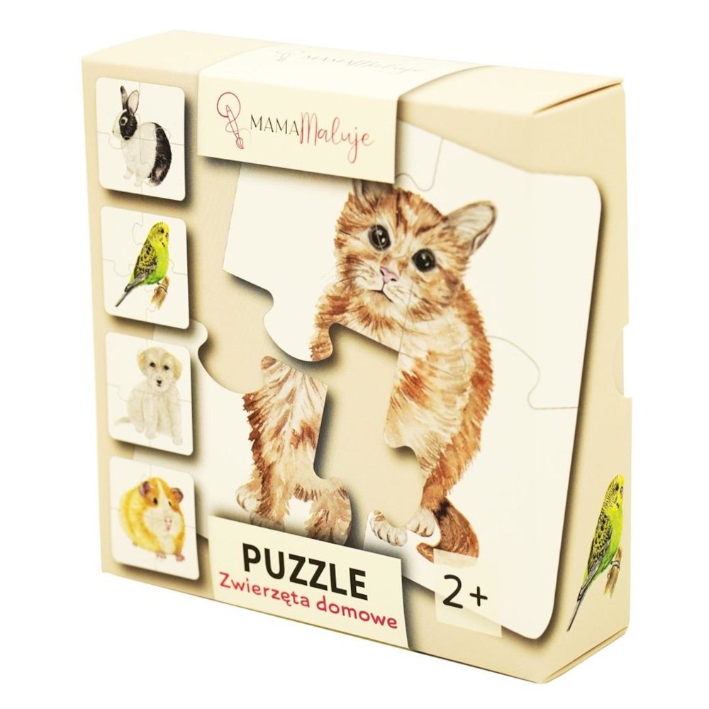 Puzzle Zwierzęta domowe zawierają 5 układanek 4-elementowych przedstawiających świnkę morską, papużkę falistą, królika, kota, psa.