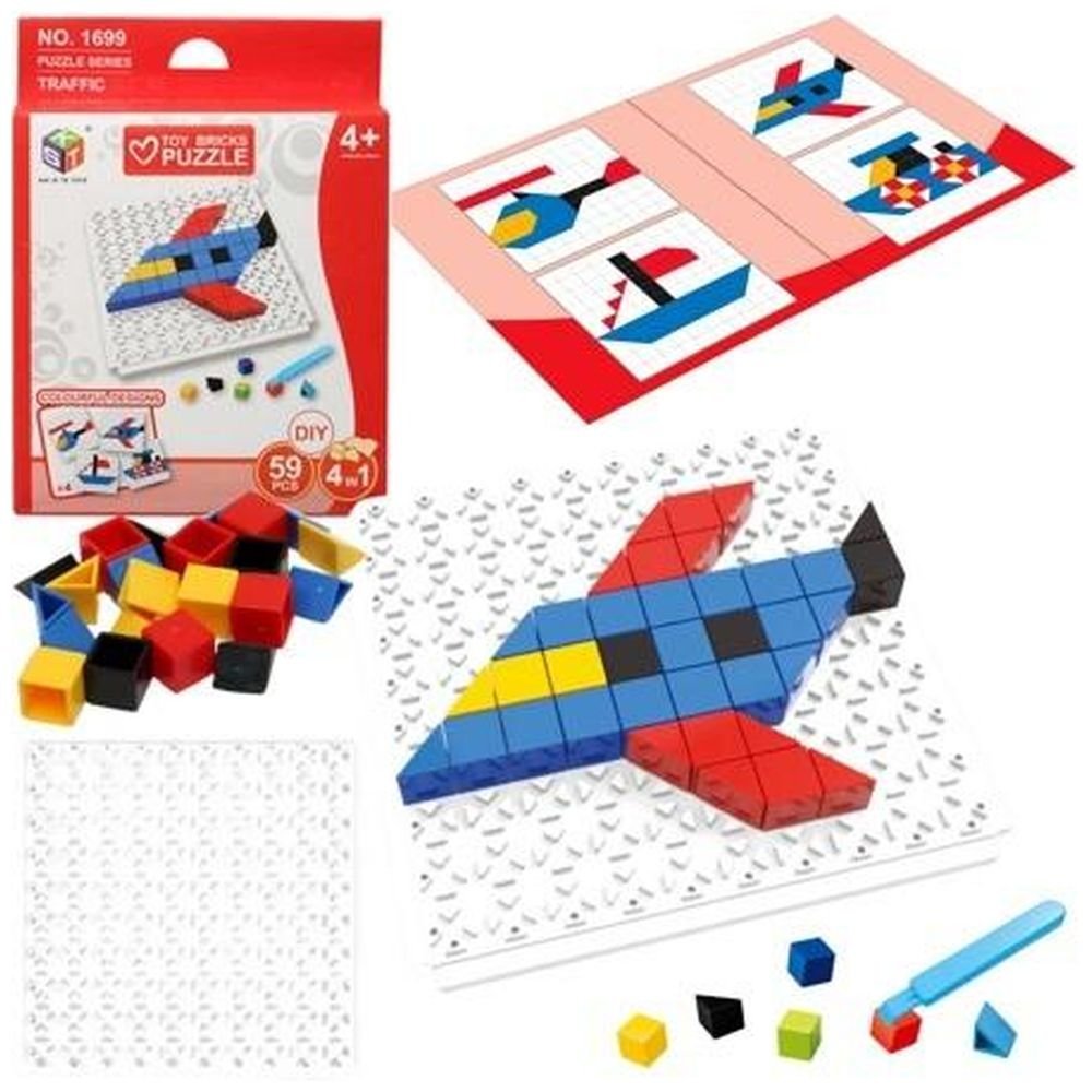 Klocki – puzzle: Zestaw zawiera 59 klocków w 4 inspirujących kolorach – niebieski, żółty, czerwony, czarny. Te różnorodne barwy, zapewniają nieograniczone możliwości układania pojazdów, łódek, statków i helikopterów. Kolory pobudzają wyobraźnię dziecka i inspirują do tworzenia różnorodnych obrazów. Klocki mają kształty trójkątów i kwadratów, co pozwala na zaznajomienie się z pierwszymi figurami geometrycznymi i łatwe tworzenie obrazków.