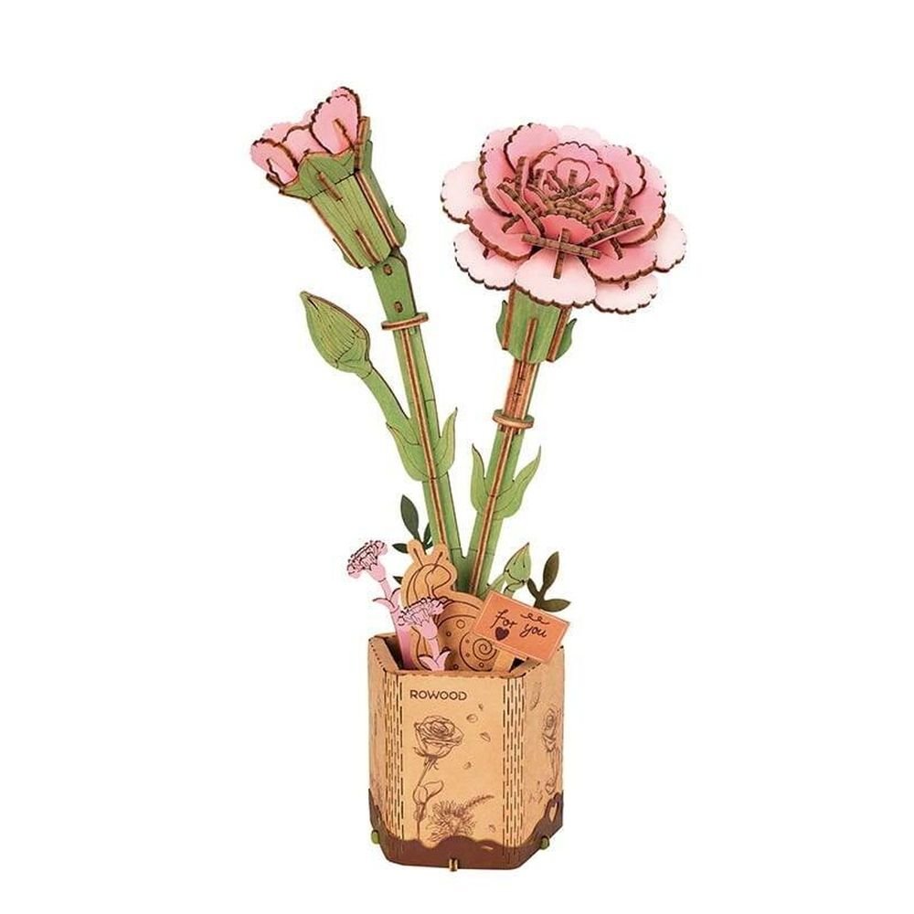 Drewniane puzzle 3D umożliwiające budowę modelu kwiatka goździka. Zestaw został wykonany z wysokiej jakości sklejki i jest w postaci arkuszy z wstępnie wyciętymi i ponumerowanymi elementami, które przed montażem należy oddzielić od wykroju, a następnie połączyć bez użycia kleju, zgodnie ze szczegółową instrukcją dołączoną do opakowania. Dzięki zastosowaniu nowoczesnej technologii obróbki drewna, Kwiat charakteryzuje oryginalna konstrukcja, a jego budowa będzie ciekawym doświadczeniem.