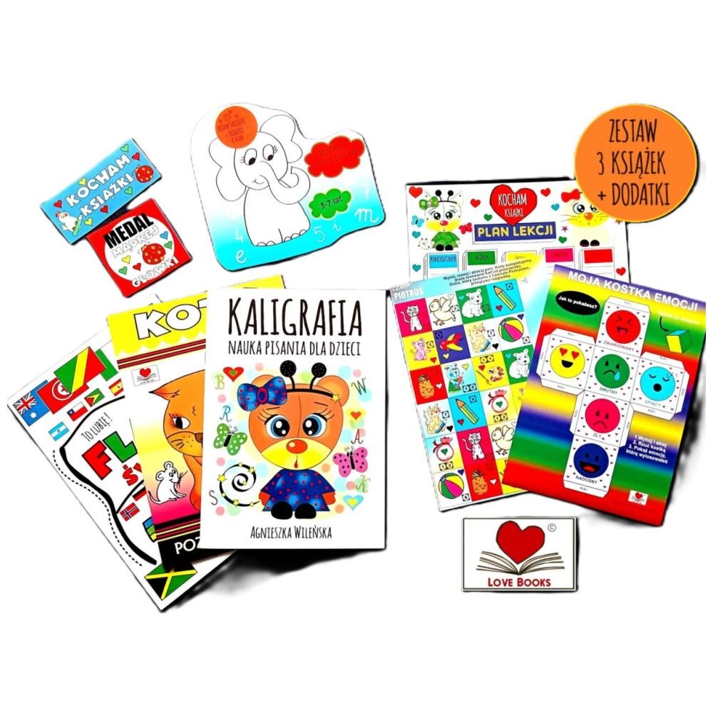 ROZWÓJ PRZEZ ZABAWĘ 3-7 LAT ZESTAW 3 KSIĄŻEK Z DODATKAMI Super zestaw 3 książek dla dzieci w wieku przedszkolnym. W zestawie następujące książki: FLAGI ŚWIATA. TO LUBIĘ! KOTY. POZNAJĘ I KOLORUJĘ KALIGRAFIA. NAUKA PISANIA DLA DZIECI W zestawie dodatkowo znajdują się naklejki, gra Piotruś do wycinania i zabawy, Wycinanka- kostka emocji, plan lekcji i zabawy. Zestaw zapakowany w foliowy worek.