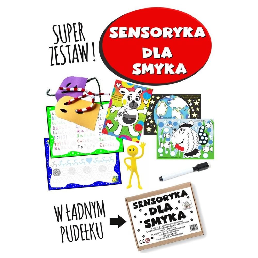 SENSORYKA DLA SMYKA Zestaw edukacyjny dla dzieci Wspaniały zestaw edukacyjny dla dzieci już od 3 roku życia. Zabawa i edukacja w jednym. Ten wspaniały zestaw edukacyjny to doskonała pomoc w zabawach rozwojowych w obszarze sensoryki. Pakiet zawiera: -Dwustronna plansza w dużym formacie A3, na papierze dwustronnie lakierowanym, służąca do wielokrotnego pisania i ścierania- to doskonałe ćwiczenie umiejętności manualnych. – Pisak suchościeralny z gąbeczką, dzięki któremu ćwiczenia, które dziecko wykona na planszy może zmazać i trenować rączkę ponownie. Dwa piękne kolorowe plakaty A3 do malowania obrazków paluszkami. Plakat A4 do kolorowania i dotykania- zawiera elementy o różnych fakturach. Zaplatanki piankowe do zabawy i przeplatania (materiał: pianka oraz sznurki do przeplatania). Zabawny ludzik do wyginania. Wspaniała zabawa sensoryczno-manualna. Kolorowanka antystresowa dla dzieci. Super frajda i nauka w jednym. Zestaw znajduje się w ładnym pudełku dodatkowo zabezpieczonym folią. Doskonały na prezent oraz jako pomoc w nauce i rozwoju.