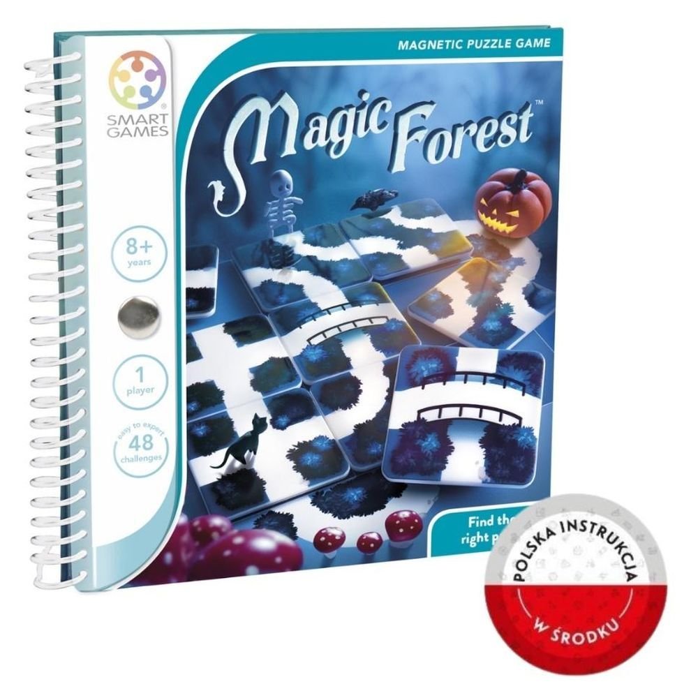 W “Magicznym Lesie”, magnetycznej grze logicznej, jest wiele tajemniczychzakamarków, kryjących skarby! Posługując się wskazówkami zawartymi wzadaniach mali gracze będą próbować wyznaczyć ścieżki, aby dotrzeć dowskazanych przedmiotów. Pamiętajcie jednak – każda ścieżka musi dokądś prowadzić! Nie chcemy przecież, zgubić się w leśnej gęstwinie.