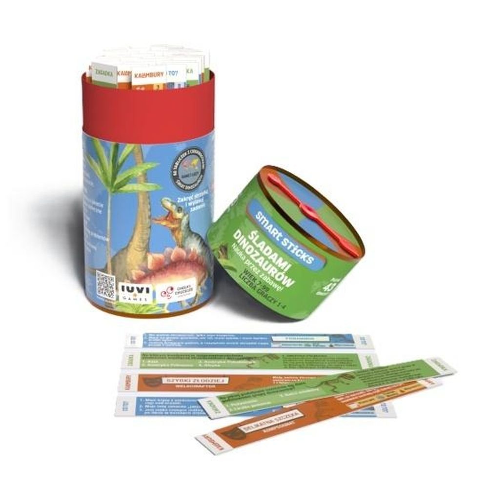 Cofnijcie się w czasie z grą Śladami dinozaurów i odkryjcie wiedzę na temat tych prehistorycznych stworzeń. Zakręćcie strzałką na tarczy i wylosujcie kategorię zadania: kalambury, co to?, zagadka. Czy potraficie powiedzieć kiedy wyginęły dinozaury? Czy wiecie, co oznacza imię Tyranozaur? Czy potraficie wskazać dinozaura, który zyskał przydomek złodziej jaj? Odpowiedzi na te pytania znajdziecie właśnie w tej fascynującej grze o dinozaurach. Zagrajcie i poznajcie aż 60 ciekawostek i faktów o tych prehistorycznych zwierzętach. Na odwrocie tabliczek znajdują się puzzle z mapą świata z dinozaurami, dzięki czemu dziecko może się bawić i uczyć, również samo! Bawcie się i uczcie, a zostańcie prawdziwymi paleontologami.
