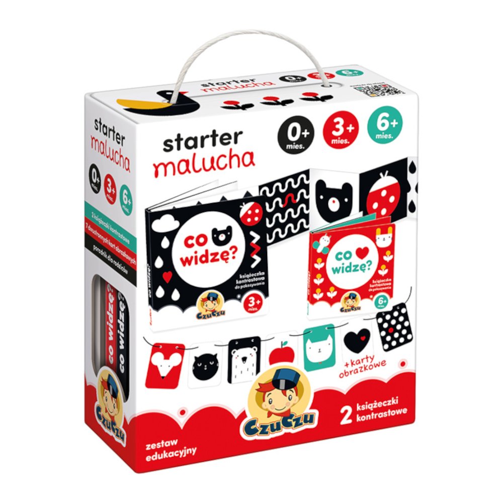 Starter malucha to zestaw kontrastowych kart i książeczek do pokazywania, który sprawdzi się w pierwszym roku życia dziecka. Do zestawu dołączyliśmy poradnik z informacjami na temat rozwoju wzroku i pomysłami na wspólną zabawę. To świetny pomysł na prezent dla rodziców niemowląt.