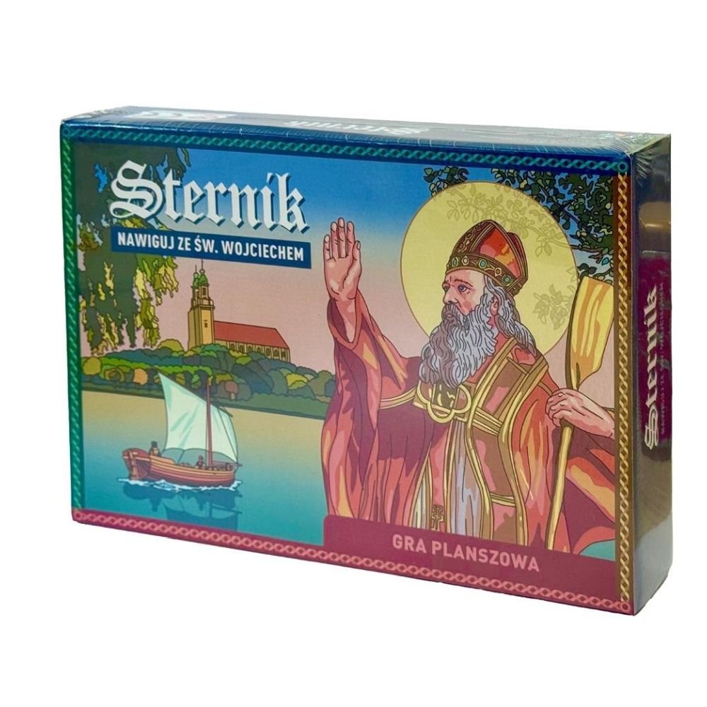 Przenieś się w czasie do X wieku i przeżyj niesamowitą podróż z Bożym Sternikiem św. Wojciechem. Przemierz Czechy, gdzie się urodził i sprawował posługę biskupią. Udaj się do Magdeburga, gdzie przez 10 lat uczył się w szkole katedralnej. Wyrusz do Rzymu, aby schronić się w klasztorze benedyktyńskim. Poznaj lepiej rodzące się państwo Polan, w którym rządzi wielki książę Bolesław Chrobry. Podejmij wyzwanie głoszenia słowa Bożego w Prusach i z pomocą Ducha Świętego pokonaj czyhające tam niebezpieczeństwa. Celem gry jest zebranie wszystkich żetonów-symboli, które nawiązują do wydarzeń z życia św. Wojciecha. Pionki ustawiamy na polu startowym w miasteczku Libice, gdzie urodził się nasz bohater. Kolor pola odpowiada kolorowi pionka. Grę rozpoczyna osoba najmłodsza. Pionkiem można się poruszać w dowolną stronę. Przeskakujemy dokładnie o taką liczbę pól, jaka odpowiada ilości oczek po rzucie kostką. Gdy stajemy na polu oznaczonym symbolem, zabieramy odpowiadający mu żeton. Umieszczamy go w swoim szablonie zgodnie z numerem, który jest na odwrocie żetonu. Wszystkie symbole są dokładnie opisane na karcie Życiorys Sternika. Możemy je wspólnie odczytywać nawet kilka razy w czasie gry, aby lepiej poznać św. Wojciecha. Po drodze możemy napotkać na różnokolorowe ponumerowane pola. Należy wtedy znaleźć odpowiadającą im kartę, przeczytać jej treść i postąpić zgodnie z instrukcją, np. przesunąć się o daną liczbę pól w dowolnym kierunku lub nie rzucać kostką w następnej kolejce, kilku kolejkach. Pionek ma doczepiany atrybut – wiosło. Sternik otrzymuje ten symbol męczeństwa, gdy stanie na polu numer 13. Zwycięzcą gry zostaje osoba, która jako pierwsza zdobędzie wszystkie żetony.