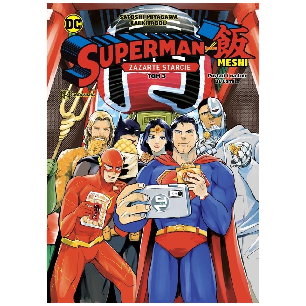 Superman zwiedził niemal całą Japonię i skosztował kilku naprawdę wykwintnych posiłków w towarzystwie wspaniałych bohaterskich przyjaciół. Ale kiedy Darkseid przybywa na Ziemię, odwiedzanie japońskich restauracji fast foodowych może się skończyć na dobre! Potrzeba połączonych sił wszystkich członków Ligi Sprawiedliwości, aby powstrzymać Darkseida i ocalić świat (i jego potrawy!). A jeśli chodzi o Lois, czy Superman będzie miał odwagę podzielić się prawdą (i posiłkiem) z kobietą, którą kocha? Trzeci i ostatni tom mangi "Superman kontra Meshi. Zażarte starcie" stworzyli Satoshi Miyagawa ("Space Battleship Tiramisu") i Kai Kitagou ("Good Morning Leon").