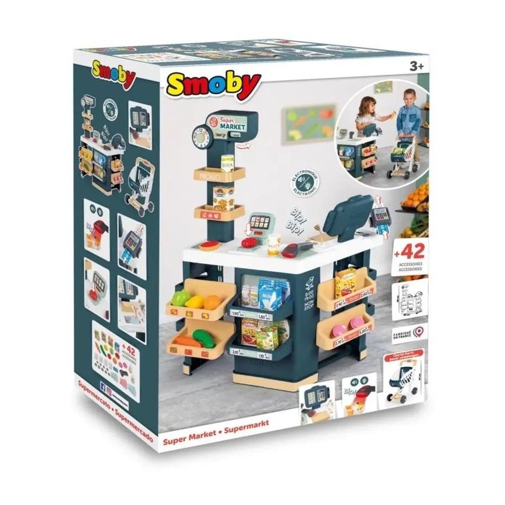 Supermarket z 42 akcesoriami: owoce, warzywa, skaner z dźwiękiem i światłem, wózek na zakupy.