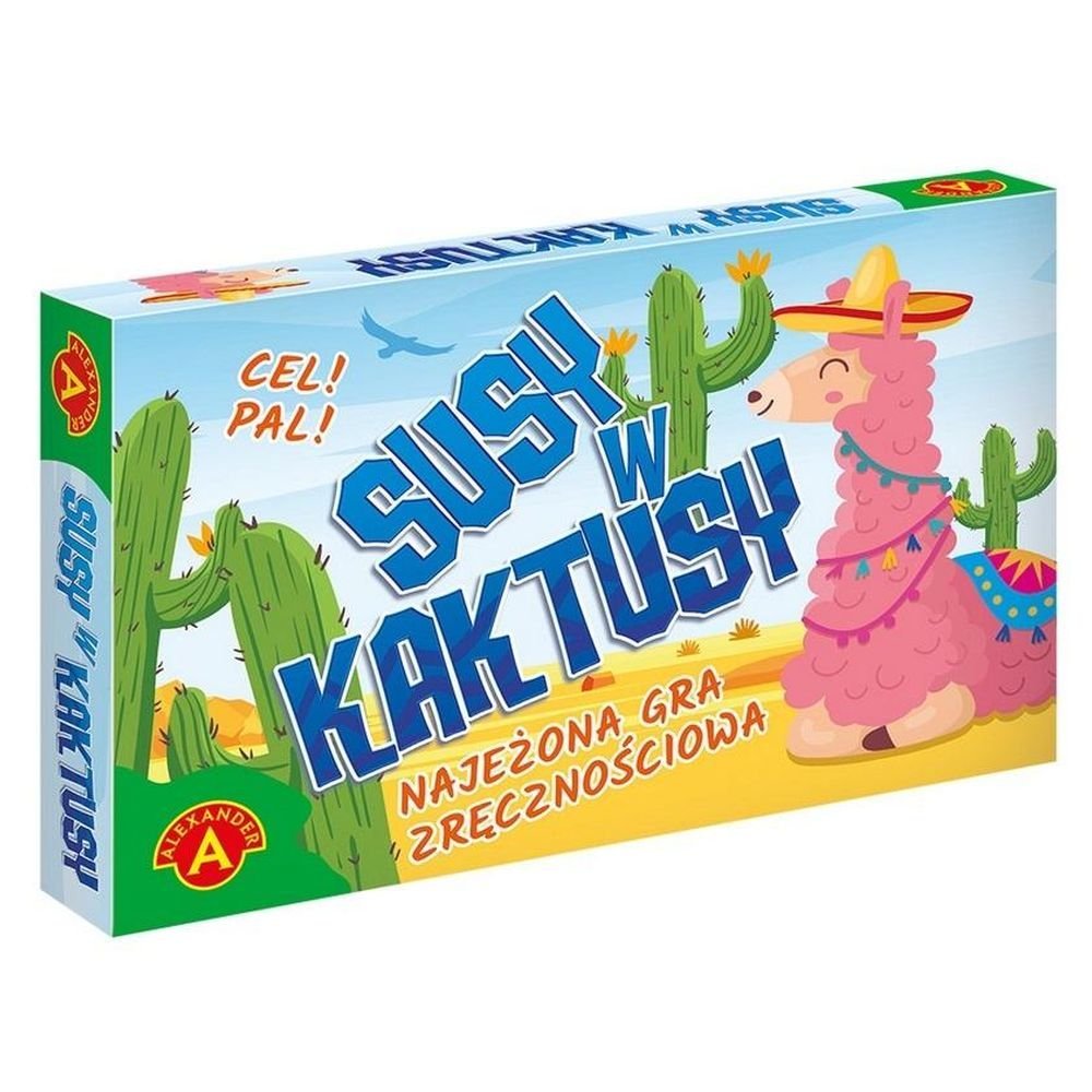 SUSY W KAKTUSY to dynamiczna gra zręcznościowa dla całej rodziny. W pudełku znajdują się katapulty i specjalna tarcza przypominająca kaktusowe pole. Gracze strzelają do niej kolorowymi czapeczkami. Zdobycie punktów nie jest jednak wcale proste. Trzeba precyzyjnie oceniać odległości i umiejętnie dobierać siłę nacisku, tak by trafiać w najwyżej punktowane pola między kaktusami. Wygrywa ta osoba, która zdobędzie największą ilość punktów.