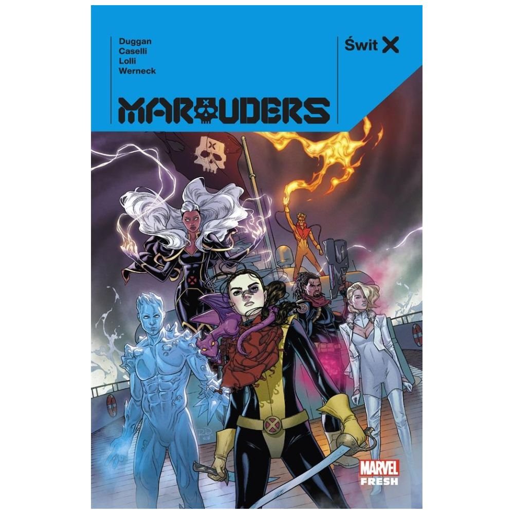 Krakoa, niepodległe państwo na Pacyfiku, przyciąga mutantów z całego świata ale nie wszystkie ludzkie kraje pozwalają im przenieść się do nowej ojczyzny. Wtedy na ratunek rusza im kapitanka Kate Pryde wraz ze swoją drużyną piratów: Icemanem, Storm, Pyro i Bishopem, którzy przemierzają Siedem Mórz, niosąc wolność swoim pobratymcom. Ale najniebezpieczniejsi rozbójnicy czają się na nich w domu, w wewnętrznym kręgu Hellfire Club, gdzie pewien król spiskuje przeciwko dwóm królowym Czy Emmie Frost i Kate uda się go przechytrzyć? Czy też wypadną za burtę wraz z całą drużyną Marauders? Scenariusz tego tomu napisał Gerry Duggan, znany między innymi z "Deadpoola", "Savage Avengers" i "Strażników Galaktyki". Rysunki stworzyli Stefano Caselli ("Avengers") i Matteo Lolli ("Deadpool"). Album zawiera materiały opublikowane pierwotnie w zeszytach "Marauders" #1-12 i "King in Black: Marauders" #1. Uwaga: tom "Świt X – Marauders" należy do cyklu "Świt X". Ukazujące się w nim komiksy kontynuują wątki z albumu "Ród X/Potęgi X", w którym scenarzysta Jonathan Hickman otworzył zupełnie nowy rozdział w historii Marvelowskich mutantów. Polecamy również serię główną opowiadającą o przygodach X-Men, czyli "Świt X – X-Men", a także samodzielny album "Świt X – New Mutants".