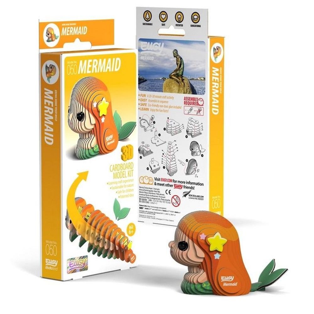 Eugy zaprojektowane w Nowej Zelandii są wykonane z przyjaznego dla środowiska kartonu pochodzącego z recyklingu i farby na bazie ryżu. Zestaw zawiera ponumerowane elementy układanki, nietoksyczny klej oraz instrukcję do zbudowania syrenki. Zbierz całą serię zwierząt, ptaków, dinozaurów i wiele innych. Dla dzieci w wieku 6 lat+.