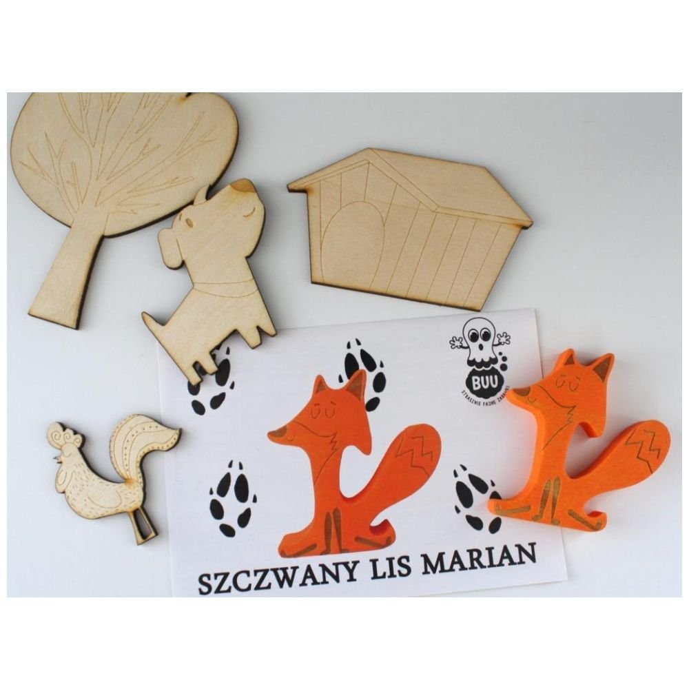 – elementy dodatkowe: pies, kogut, 2 kury, płot, krzew duży, krzew mały, buda, drzewo, strumień, 4 jajka, 9 podstawek ( wszystkie elementy wykonane z surowej sklejki, by można było je dowolnie pokolorować)