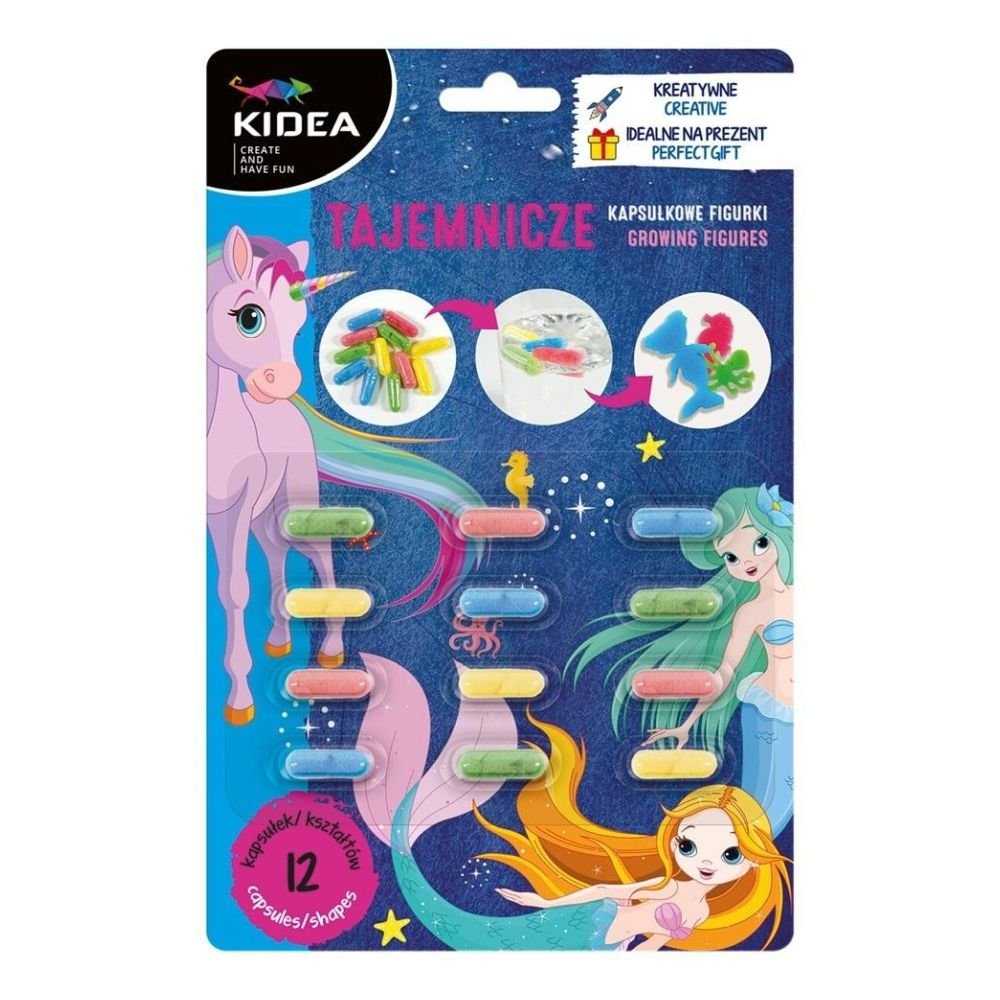 Wyrusz w podróż do krainy magii z Tajemniczymi kapsułkami figurkami Kidea. Skrywają one w sobie ukryte kształty, które ujawniają się po zanurzeniu w wodzie. Wrzuć kapsułkę do wanny lub miski z ciepłą wodą, a zobaczysz, jak zaczynają się rozpuszczać, uwalniając ukryte w nich stworzenia morskie. Sprawdzą się jako dodatek do kąpieli łącząc w sobie naukę z kreatywną zabawą