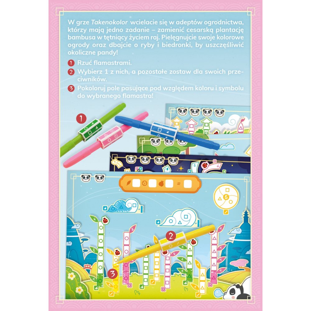 Wciel się w jednego z adeptów ogrodnictwa, którzy nieustannie pielęgnują swoje plantacje bambusa, tworzą elementy wodne, a także zwabiają ryby i biedronki, aby zamienić dostępną przestrzeń w mały, kolorowy zakątek raju! W grze Takenokolor będziesz kolorować swój ogród, kierując się symbolami na nakładkach i kolorami flamastrów, aby zdobyć jak najwięcej punktów.