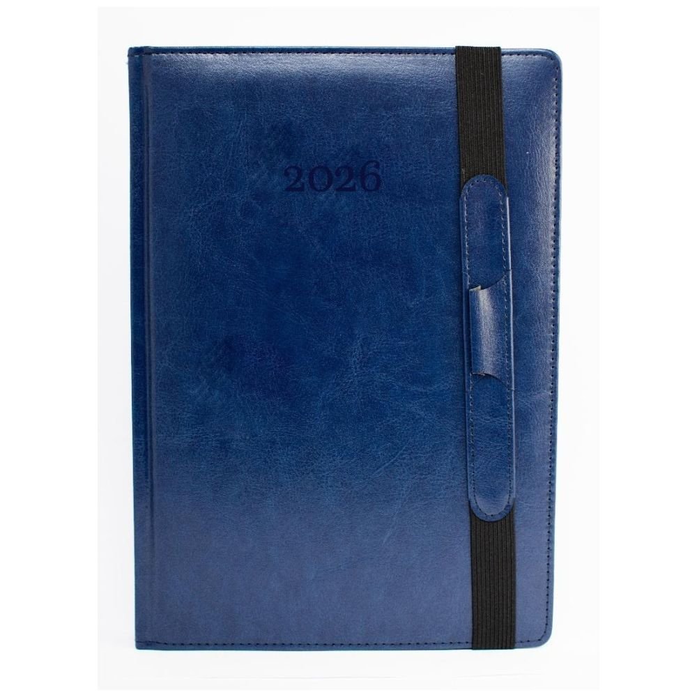 OKŁADKA: skóropodobna Nebraska z obszyciem, z gąbką 3mm, tłoczenie roku, gumka 2cm z uchwytem na długopis