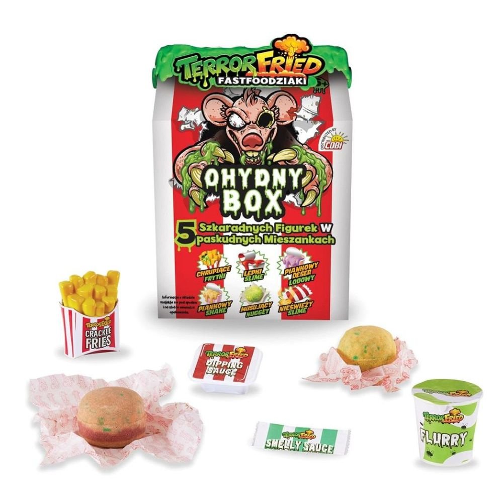 Kto zamawiał ohydny box? Fastfoodowa kuchnia serwuje dzisiaj prawdziwe ohydztwa! 5 szkaradnych figurek w 5 paskudnych mieszankach! W zestawie znajdziesz musujący nugget, chrupiące frytki, lepki slime, nieświeży slime, piankowy deser lodowy, piankowy shake.