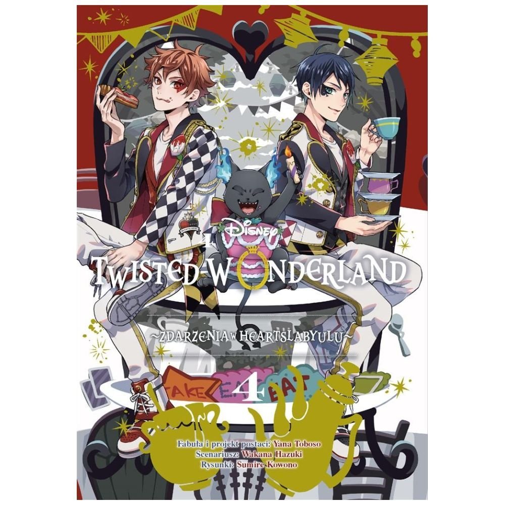 Manga czytana od prawej do lewej. Czwarty tom mangi o niezwykłych przygodach nastolatka w magicznym świecie o nazwie Twisted Wonderland. Komiksowa wersja niezmiernie popularnej gry mobilnej "Disney Twisted-Wonderland", stworzona przez ludzi, którzy przygotowali tę grę. Uczeń szkoły średniej – Yu – stawia czoło kolejnym zadziwiającym wyzwaniom w niezwykłym świecie Twisted Wonderland, do którego trafił w tajemniczych okolicznościach i został przyjęty do akademii magii, Night Raven College. Riddle, przewodniczący domu Heartslabyul, pozwala swoim emocjom i magii wymknąć się spod kontroli i ulega przeplamieniu! Yu dołącza do Grimma, Ace'a, Deuce'a, Treya i Catera, żeby zmierzyć się z Riddle'em, ale Jak to się wszystko zakończy? Finał będzie zaskakujący.