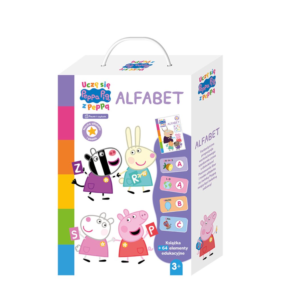edukacyjnego linii książek Uczę się z Peppą. W środku przedszkolak znajdzie książkę 'Alfabet' oraz 64 dwustronne elementy edukacyjne do nauki alfabetu.
