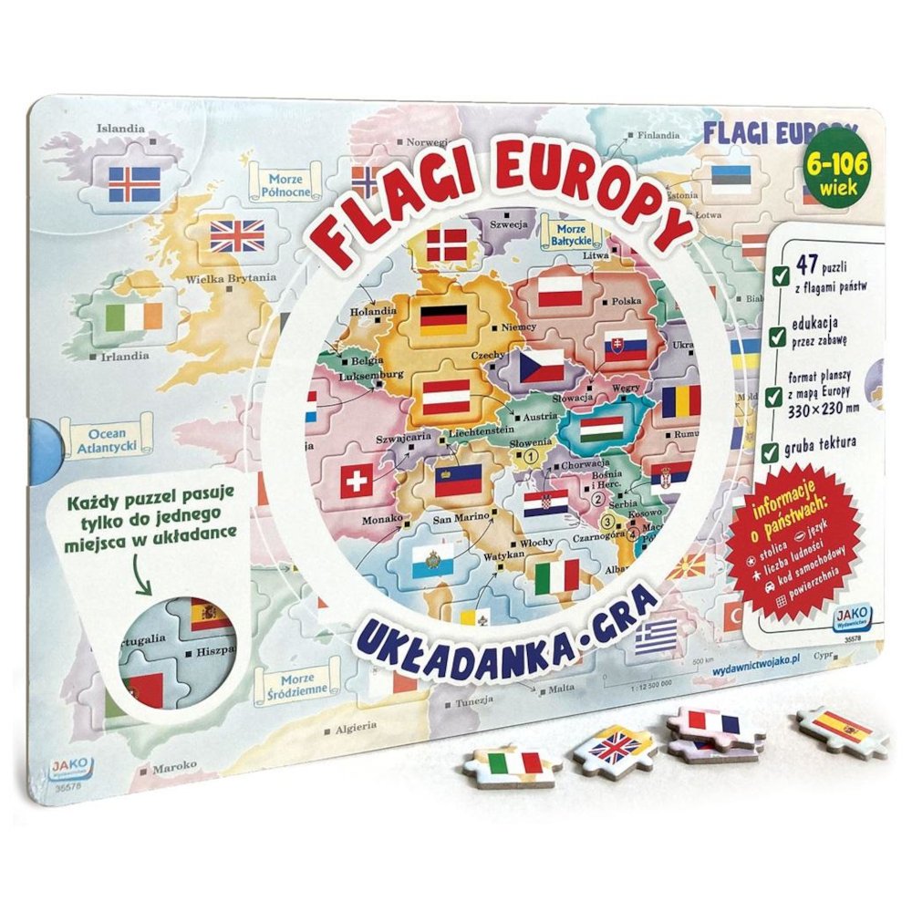 Edukacyjna układanka z flagami państw Europy to innowacyjna propozycja dla miłośników flag w każdym wieku – Forma układanki umożliwia również wykorzystanie jej jako gry planszowej. Plansza jest wykonana z grubej tektury, z wykrojonymi okienkami puzzli. W warstwie podkładowej znajdują się otwory ułatwiające wyciąganie puzzli z planszy. Układanka jest zapakowana w praktyczne, kartonowe etui. UKŁADANKA. Układanka składa się z planszy z mapą Europy oraz z 47 puzzli z flagami państw. Celem układanki jest poprawne dopasowanie flag do odpowiadających im państw. Należy odnaleźć na mapie państwo, do którego należy flaga, i umieścić puzzel w odpowiednim miejscu. Każdy puzzel ma unikalny kształt, posiada wypustki na bokach, przy czym strona bez wypustek oznacza dolną część flagi. W przypadku nieprawidłowego przypisania flagi do państwa niemożliwe będzie umieszczenie puzzla w układance. GRA. Liczba graczy: 2-4 Celem gry jest pozbycie się puzzli z flagami poprzez ich umieszczenie w odpowiednich miejscach na układance (patrz: instrukcja układanki). Puzzle ułóżcie w stos obok planszy, flagi mają być zakryte. Grę rozpoczyna najmłodszy gracz, a następnie kolejka przebiega zgodnie z kierunkiem ruchu wskazówek zegara. Gracz bierze jednego puzzla ze stosu i stara się umieścić go w odpowiednim miejscu układanki w wyznaczonym czasie (np. 10 sekund). Jeśli nie zdoła tego zrobić, zabiera go do siebie. Każdy taki puzzel stanowi punkt karny. Następnie jest ruch kolejnego gracza. Gra kończy się, gdy na stosie nie ma już żadnych puzzli. Wygrywa osoba z najmniejszą liczbą punktów karnych. Gra może zakończyć się remisem. Wariant: zamiast grać na czas, możecie się umówić, że w danej kolejce każdy z graczy może przyłożyć puzzla do jednego, dwóch lub trzech miejsc w układance.