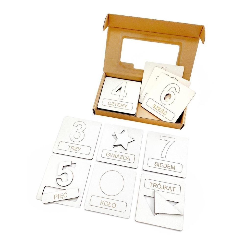 Zawiera 45 elementów (15 tabliczek z wyciętymi kształtami, 15 kształtów, 15 nazw kształtów).