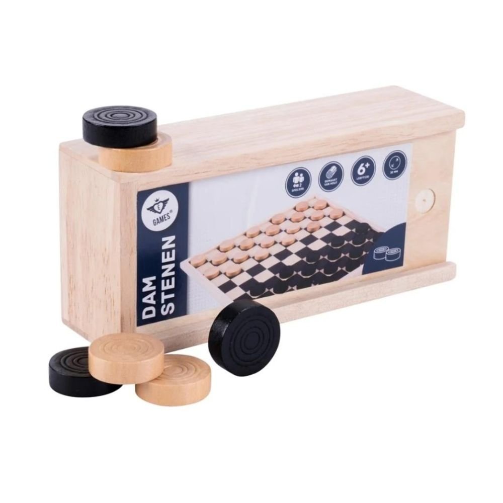 Warcaby czarne/naturalne drewno jesionowe 30 mm w drewnianej skrzyni z przesuwaną pokrywą.