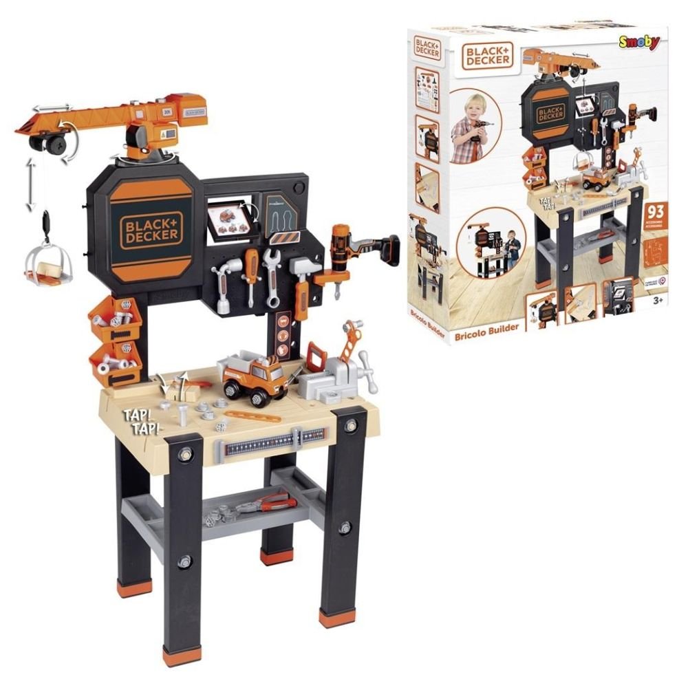 Realistyczny stół warsztatowy z dźwigiem do przemieszczania różnych elementów budowlanych, półkami. Zestaw zawiera 93 akcesoria, w tym 7 narzędzi: między innymi mechaniczna wkrętarka, śrubokręt, młotek, piła, kombinerki, imadło, ciężarówka do zbudowania oraz śruby, gwoździe i nakrętki. Wyprodukowane we Francji. Wymiary: 82 x 34 x 117 cm, 3 l+