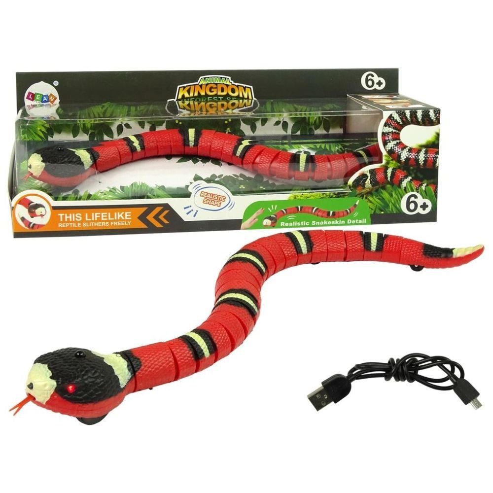 Zdalnie Sterowany Wąż Na Dotyk Czerwony Czarne Paski Jeśli Twoje dziecko uwielbia niecodzienne zabawki, a do tego lubi robić psikusy domownikom i kolegom, wybierz zdalnie sterowanego realistycznego węża. Jest niezwykle realistyczny, straszny i efektywny wąż. Nasz okaz porusza się, wystawia język i świeci. Twój maluch na pewno będzie zadowolony! Ta interaktywna zabawka z pewnością posłuży do tworzenia wielu ciekawych zabaw, rozwijając tym pomysłowość i kreatywność Twojego dziecka. Wąż ma kolor czerwony w czarne, wyraziste paski. Ładowanie odbywa się poprzez USB. Uruchamia się go poprzez dotyk. Wystarczy zbliżyć rękę do głowy węża, a zobaczysz jak w zawrotnym tempie, zacznie pełznąć po podłodze. Podczas pełzania wysuwa język i go chowie. Czerwony ma około 40 cm długości, dzięki czemu Twoje dziecko z powodzeniem wystraszy niejedną koleżankę i kolegę! Po wewnętrznej stronie interaktywnego węża umieszczone są kółka, pozwalające na zabawę sterowanym gadem na różnych powierzchniach – między innymi na podłodze, kaflach czy dywanie. Wymiary elementów: – długość węża: 40 cm Wymiary opakowania: 35 cm x 12 cm x 10 cm Wąż posiada certyfikat CE, a jego produkcja jest zgodna z obowiązującą normą EN 71. Zabawka przeznaczona jest dla wszystkich dzieci powyżej 6. roku życia.