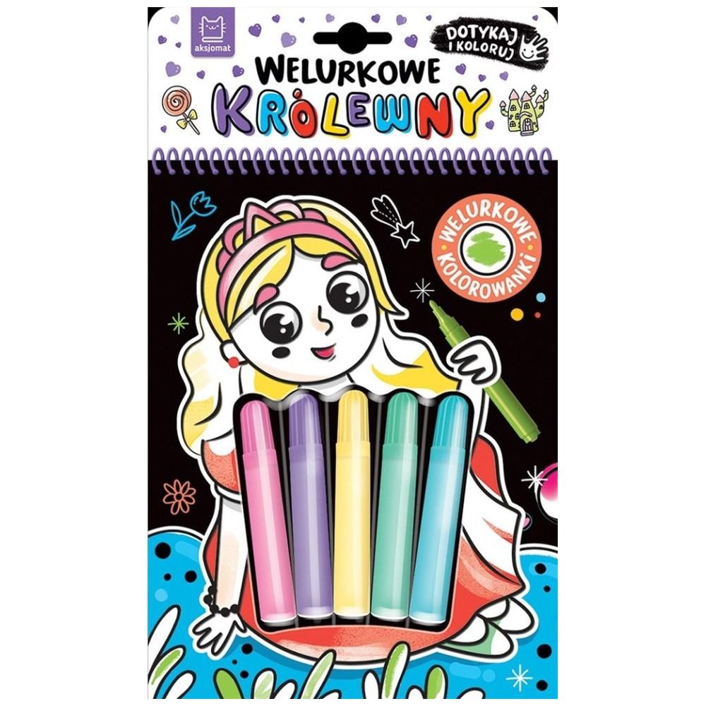 "Welurkowe królewny" to kolorowanka sensoryczna z dołączonymi pisakami. Tło obrazków pokrywa czarny welur, który podkreśla głębię kolorów, zapewnia wrażenia sensoryczne i ogranicza wychodzenie poza linię. Dzięki perforacji pokolorowaną pracę można oderwać, włożyć do ramki i podarować w prezencie lub ozdobić nią pokój. Książeczki z serii "Welurkowe kolorowanki":