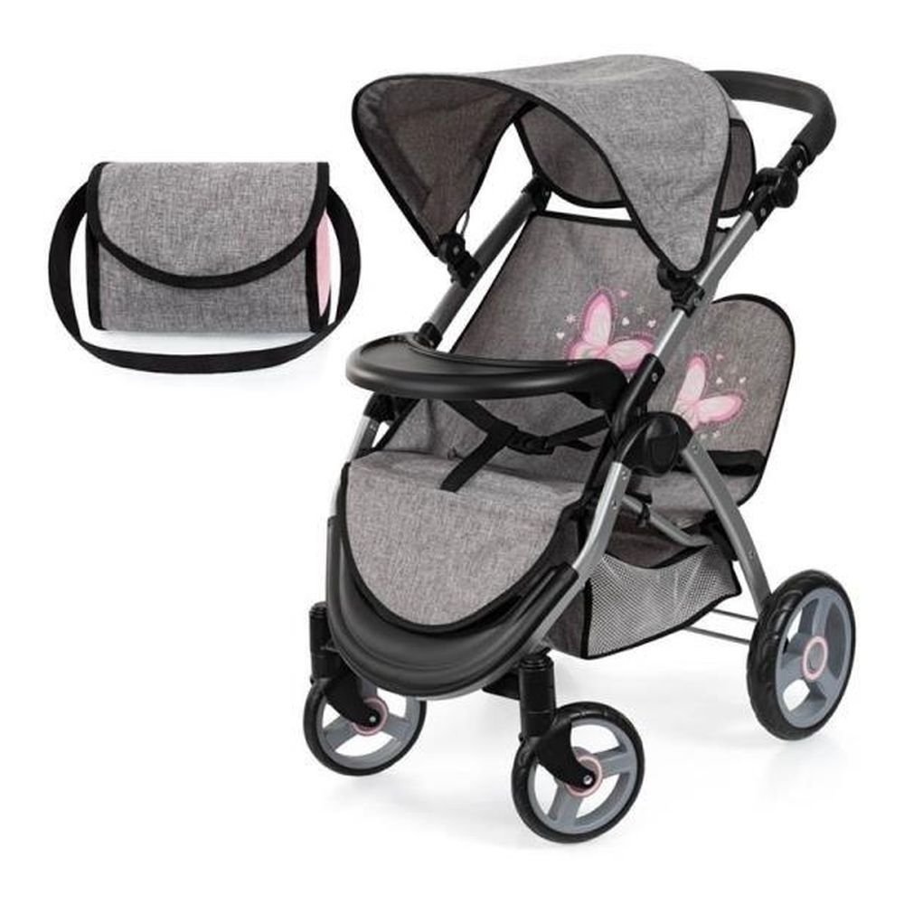 Ten nowoczesny podwójny wózek dla lalek posiada nowoczesny design i jest wyposażony w torbę. Przeznaczony jest dla lalek o wysokości do 46 cm. Siedzenie wyposażone jest w zamontowaną podkładkę, dzięki czemu można w wózku wygodnie karmić lalkę. Dodatkowo wózek dla bliźniaków posiada pasy bezpieczeństwa, dzięki którym lalki są zabezpieczone przed wypadnięciem. Dzięki regulowanej rączce wózek ten można łatwo dostosować do wzrostu dziecka. Skrętne przednie kola pomagają łatwo pokonywać zakręty. Ten wózek można złożyć i transportować dzięki czemu zaoszczędzisz miejsce podczas przechowywania. Zintegrowany koszyk na zakupy oferuje również miejsce na wszystkie niezbędne akcesoria dla lalek. Torba na ramie w dopasowanym kolorze
