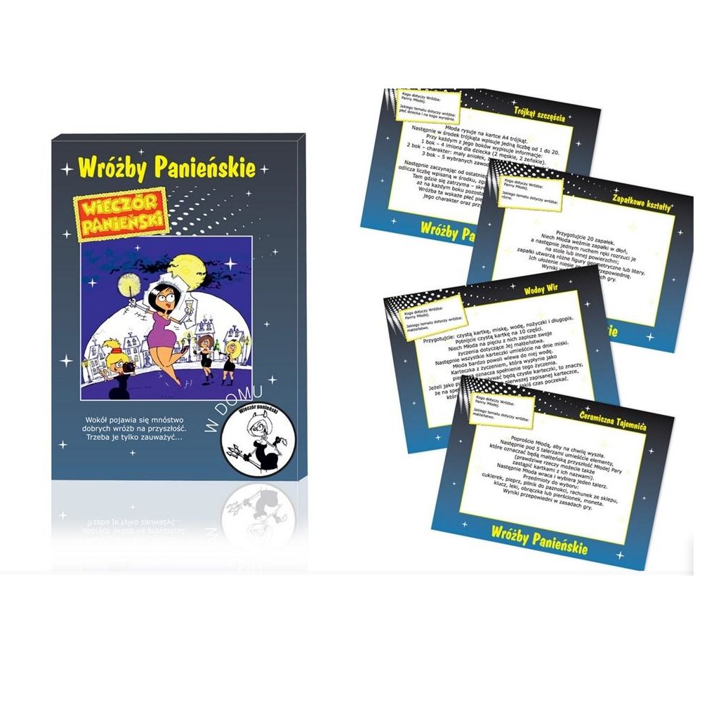 Legenda głosi, że podczas wieczoru panieńskiego uczestnikom zabawy towarzyszy niepowtarzalna magia, która ujawnia zdolność przepowiadania zdarzeń. W grze WRÓŻBY PANIEŃSKIE znajduje się 12 wróżb, które w połączeniu z magiczną aurą wieczoru