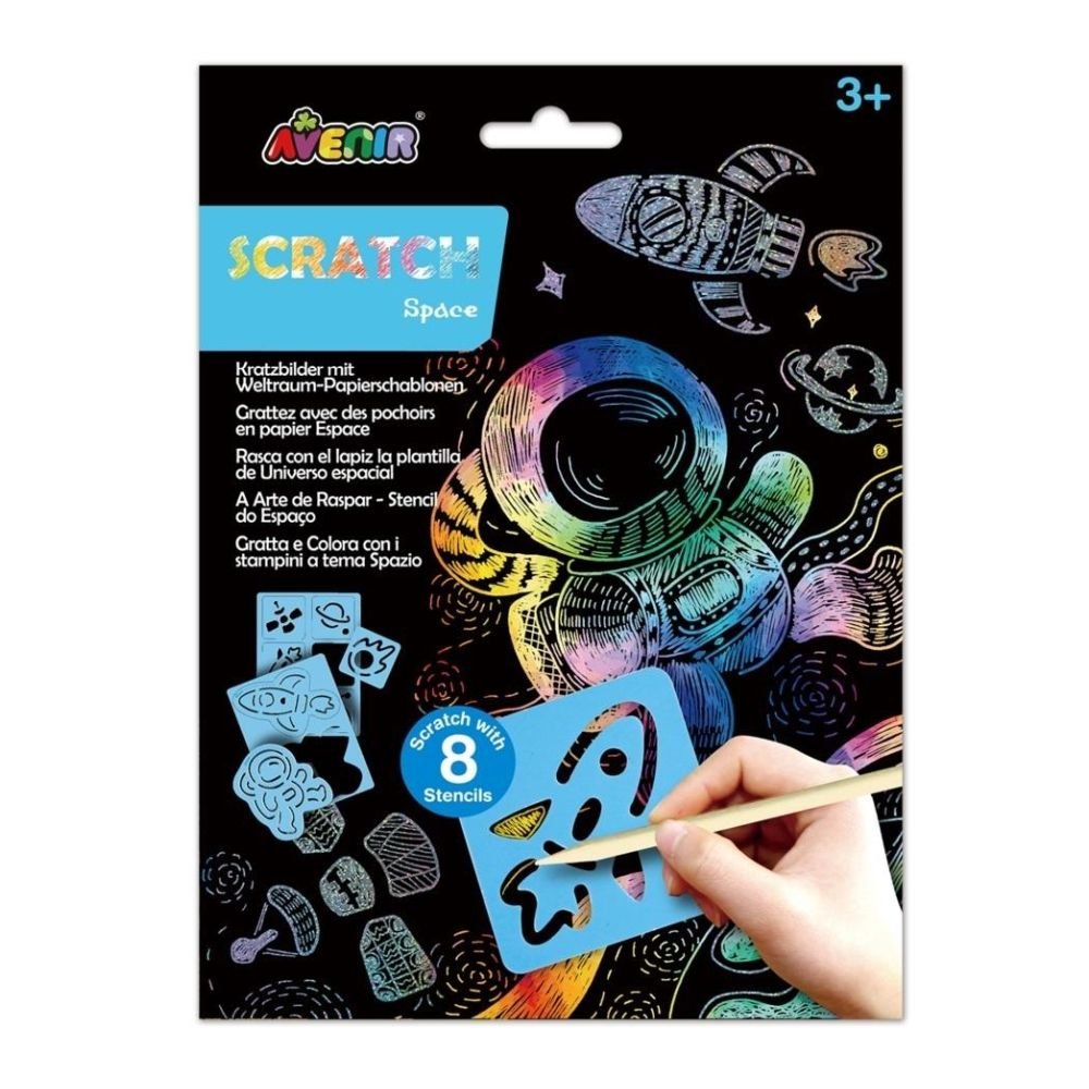 Avenir Scratch to zupełnie nowe podejście do prac ręcznych. Wyjątkowy arkusz, na którym tworzy się poprzez zdrapywanie warstwy wierzchniej, by odsłonić wielobarwną warstwę spodnią. Zdrap 2 magiczne arkusze kosmosu, korzystając z 8 szablonów z motywami kosmos. Do zestawu dołaczony również patyczek do zdrapywania oraz szmatka do wycierania.