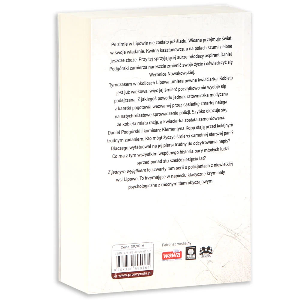 Z jednym wyjątkiem to czwarty tom serii o policjantach z niewielkiej wsi Lipowo. To trzymające w napięciu klasyczne kryminały psychologiczne z mocnym tłem obyczajowym.