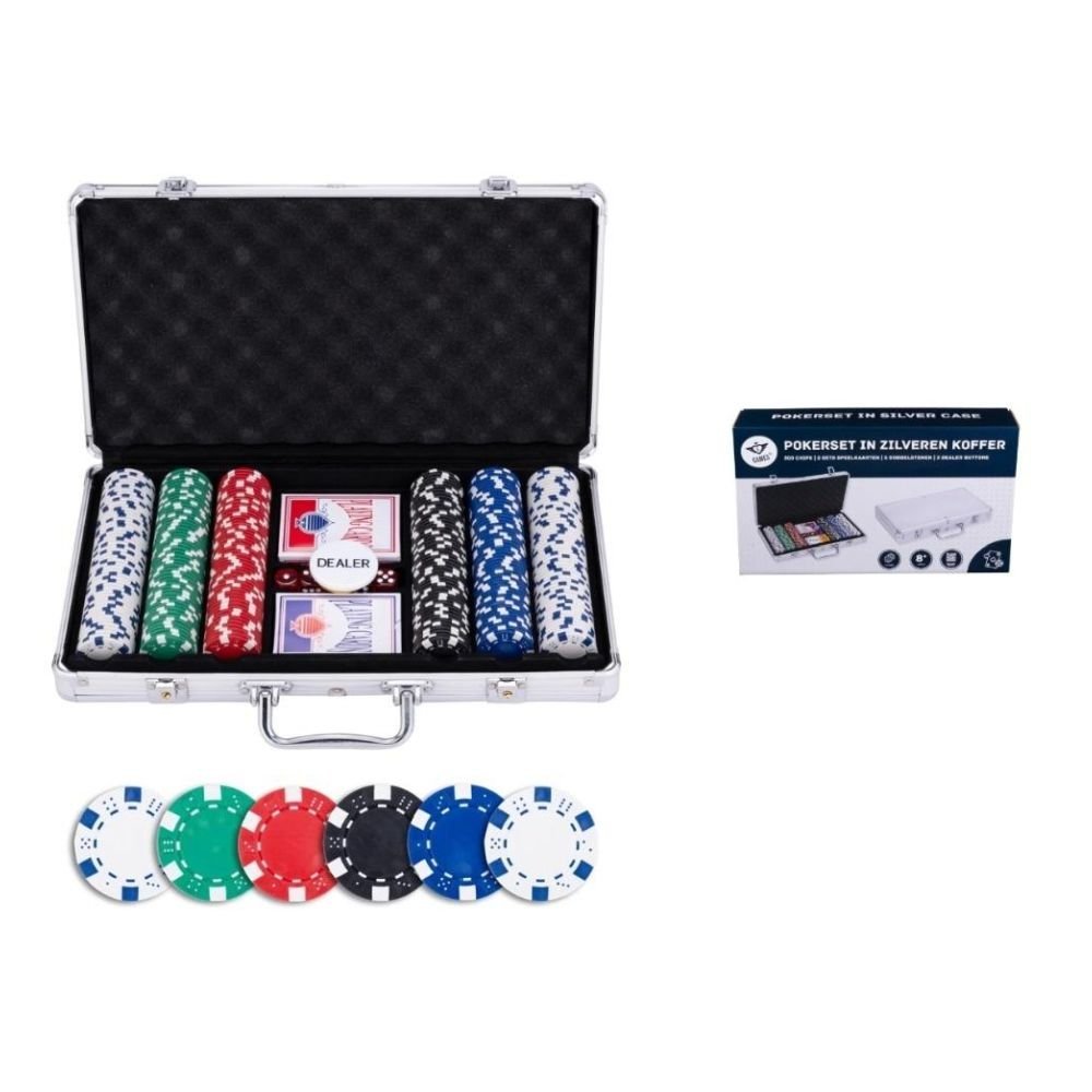 Zestaw do pokera zawiera dwie talie kart, 300 żetonów Dice o masie 11,5 g (bez nominałówi), trzy znaczniki krupiera, pięć kości i srebrne etui z zaokrąglonymi rogami.