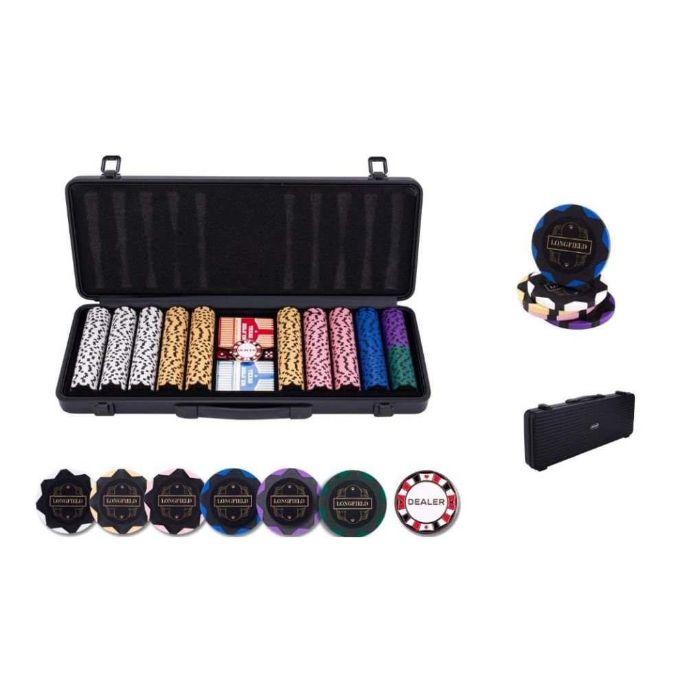 Zestaw do pokera zawiera dwie talie kart, 500 żetonów, 1 żeton rozdającego, pięć kości i czarne aluminiowe opakowanie z zaokrąglonymi rogami.
