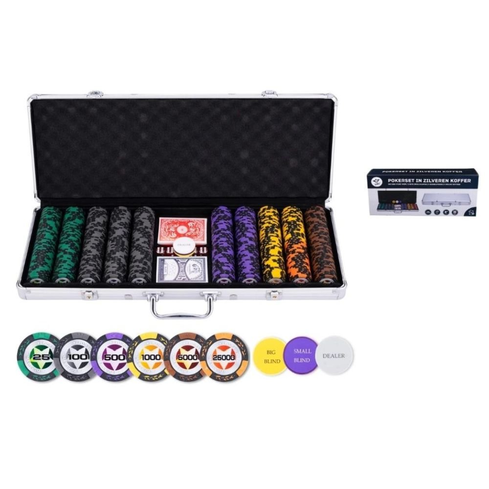 Zestaw do pokera zawiera dwie talie kart, 500 żetonów (z nominałem), trzy znaczniki krupiera, pięć kości i srebrne etui z zaokrąglonymi rogami.