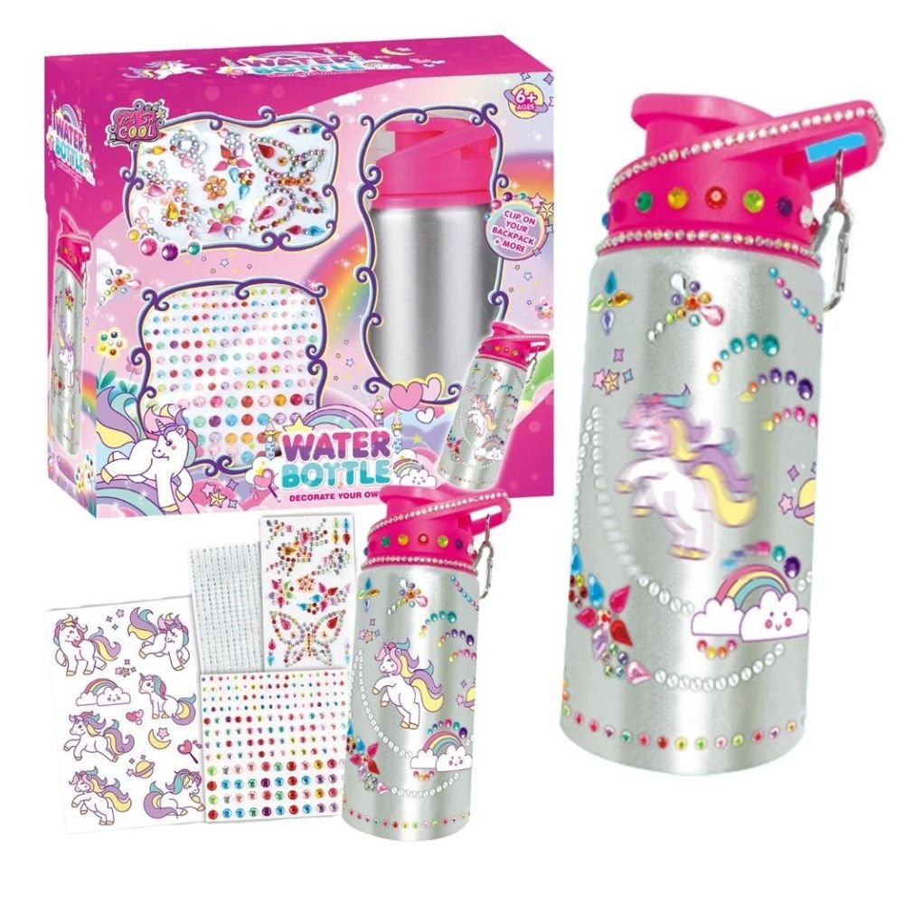 Zestaw zawiera butelkę na wodę, naklejki oraz diamenciki.