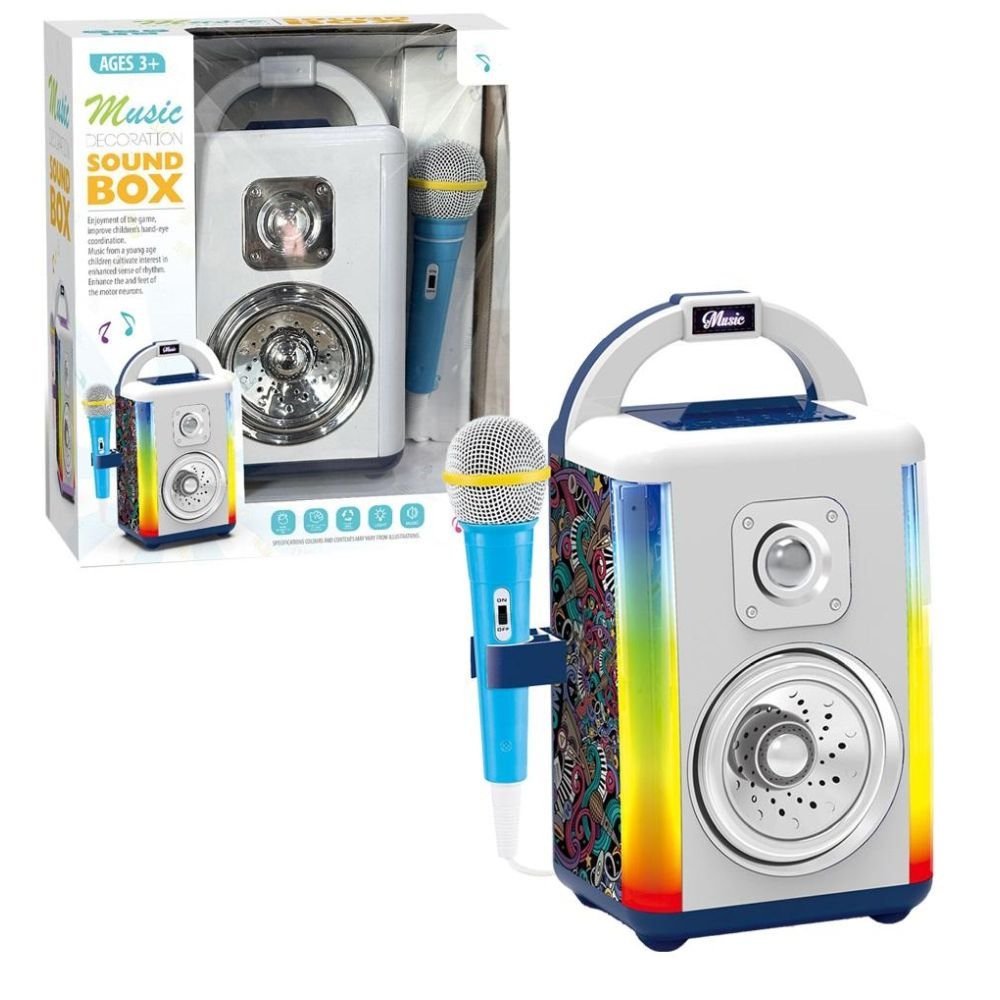 Zestaw muzyczny z mikrofonem. Funkcje: bluetooth, muzyka, aplauz, nagrywanie, zmienianie głosu, mikrofon, światło, regulacja głośności.