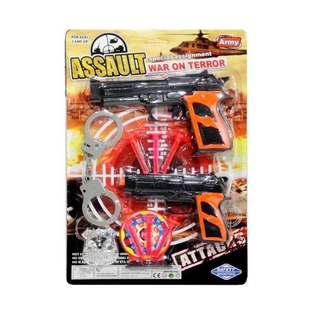 Zestaw 2 pistoletów wraz z 6 strzałkami i kajdankami. Sprawdzi się podczas balików i będzie stanowił uzupełnienie stroju np.