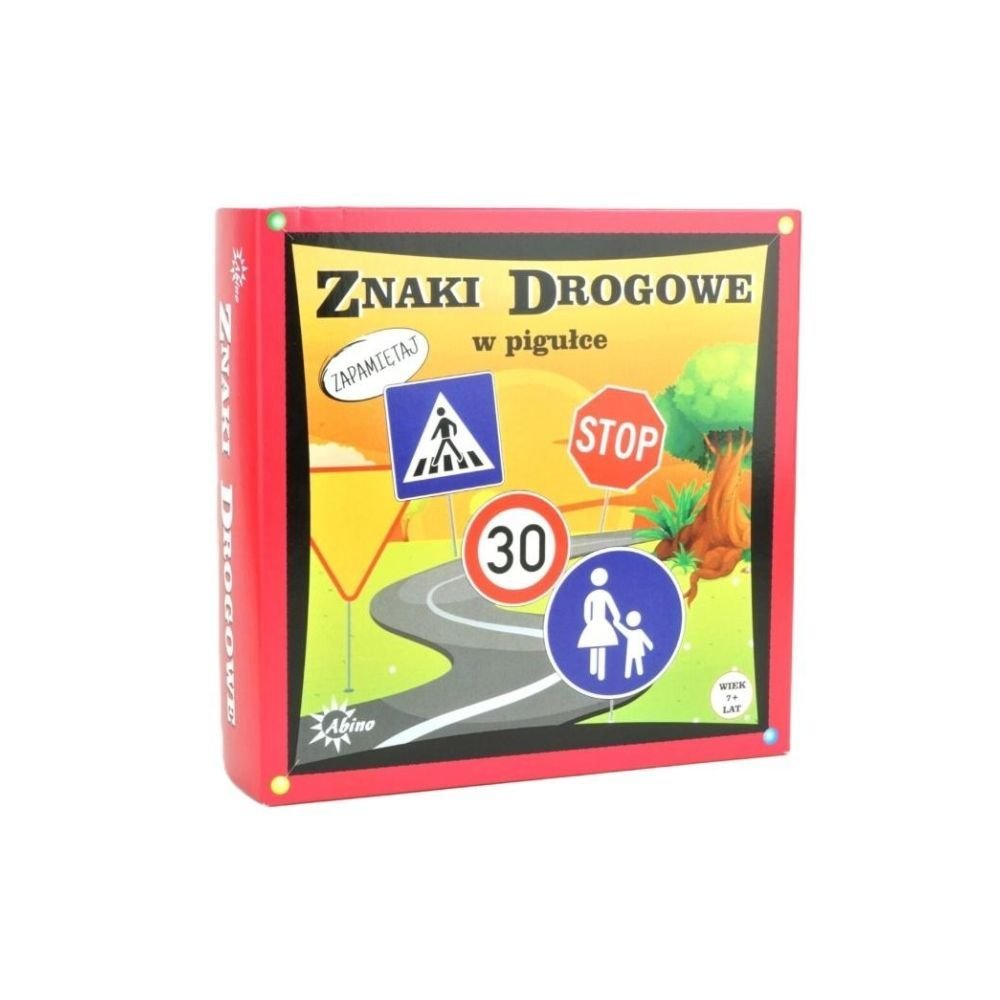 Gra zawiera 30 okrągłych kart z rysunkami związanymi z wiedzą o znakach drogowych.